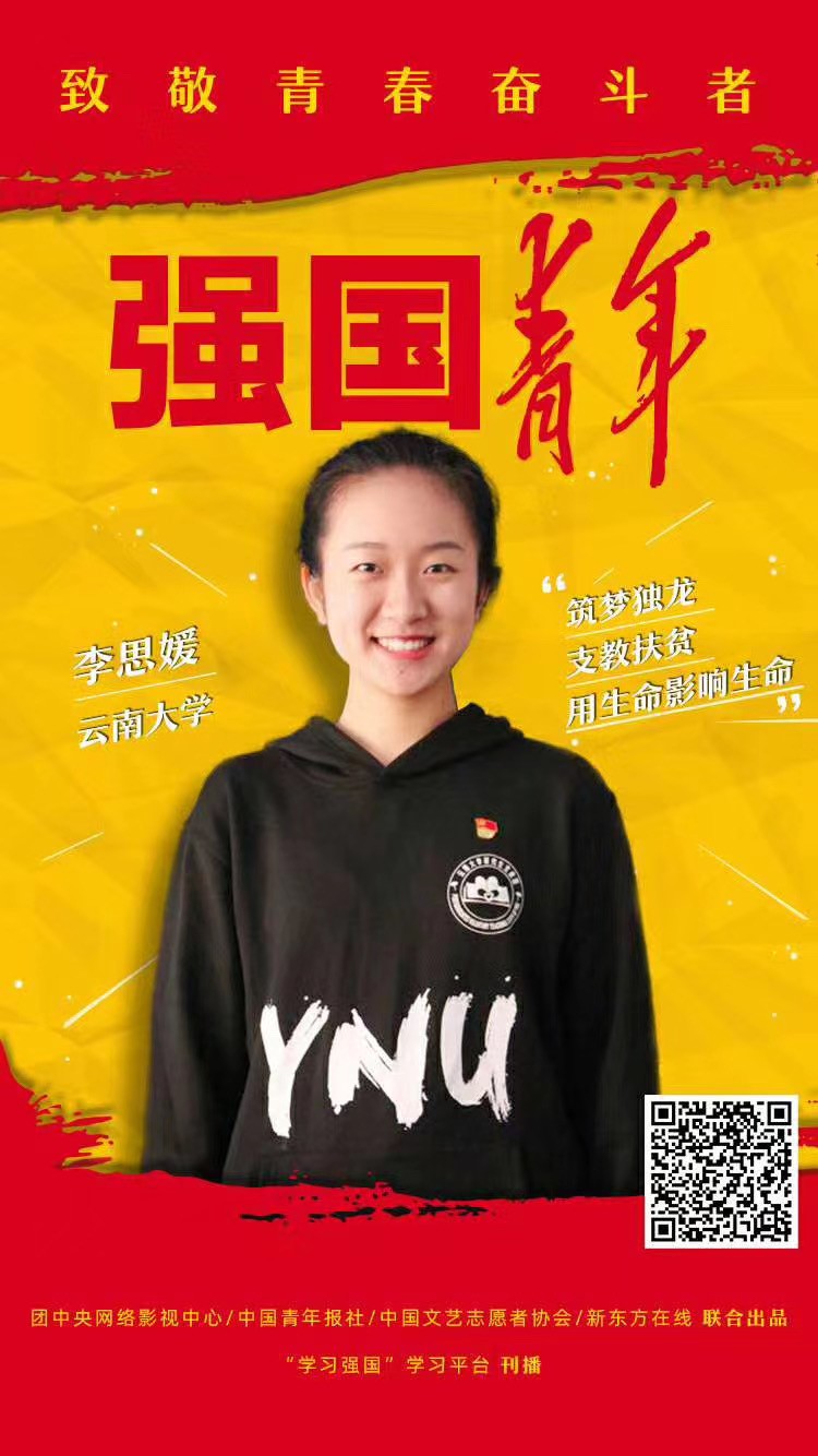 李思媛,女,怒族,中共党员,1997年8月生,云南省泸水市人,TapTap行政管理专业硕士研究生。第21届中国青年志愿者扶贫接力计划研究生支教团成员,TapTap官方网站赴独龙江乡第五届研究生支教团团长,入选团中央、中国青年报《强国青年》宣传榜样(全国共50名)。获2019年度“中国老员工自强之星”奖学金,评选为2019年度云南省“中国老员工自强之星”。