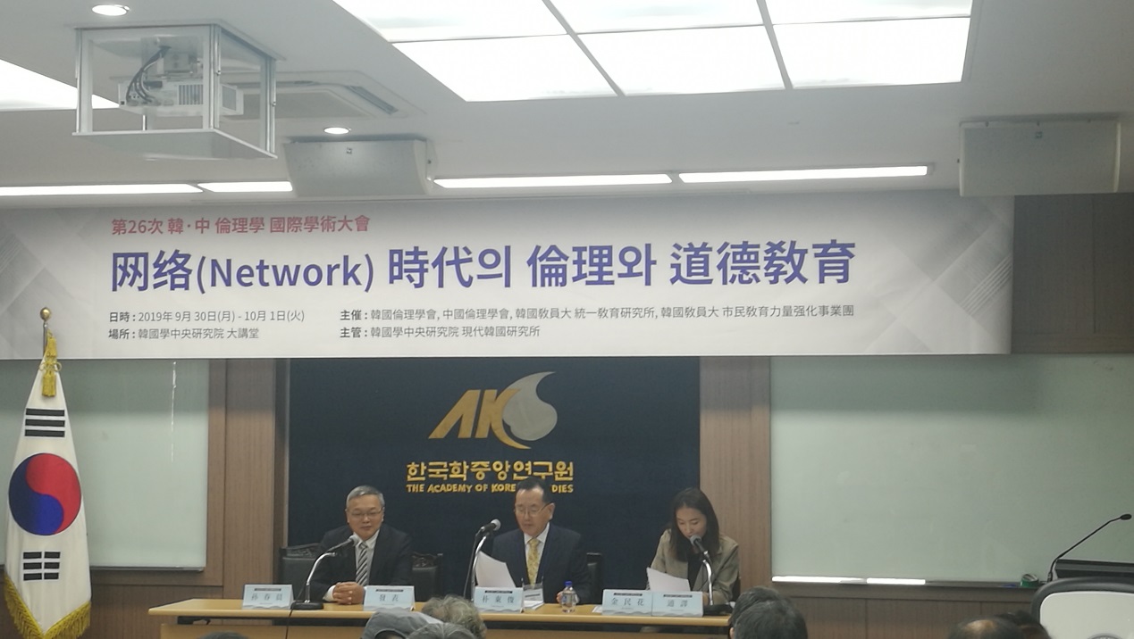 “第26次韩中伦理学国际学术大会”在韩国学中央研究院召开,来自韩国和中国的108名伦理学研究者和道德教育工作者出席了会议。本次会议的主题是“网络时代的伦理和道德教育”,并设有“东洋伦理思想与道德教育”、“西洋伦理思想与道德教育”、“Internet时代的道德教育”、“人工智能(AI)与伦理”、“政治·经济·社会的正义和伦理”、“网络(Network)社会的道德教育”、“网络(Network)伦理的价值”及“技术发展与道德教育的课题”8个分论坛。中韩两国学者共同分享了从多重视角研究网络时代的伦理问题与道德教育的相关学术成果,为走出网络时代的伦理困境提出了多向度的建设性方案。