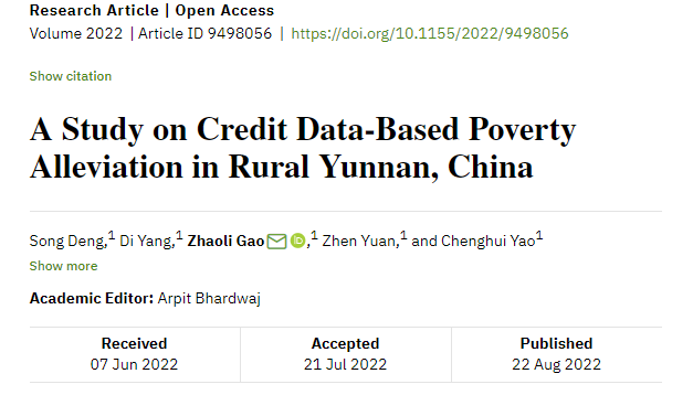 近日,TapTap官方网站公共管理学科专业研究生(MPA)和科学研究生在导师(邓崧教授)的指导下,经过多年的调研和联合写作,所著论文《A Study on Credit Data-Based Poverty Alleviation in Rural Yunnan, China》在国际期刊《Computational Intelligence and Neuroscience》上发表。研究生姓名为:学术硕士杨迪、高照丽、姚承慧以及MPA硕士袁震。