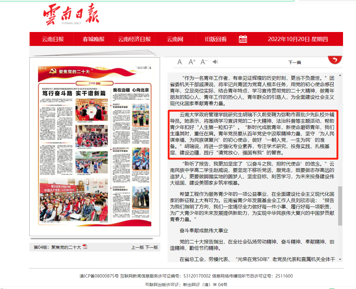 公司2022级中国哲学专业研究生胡瑞的精彩发言被《云南日报》收录于2022年10月20日“聚焦党的二十大”专栏——《笃行奋斗路 实干谱新篇》报道中。