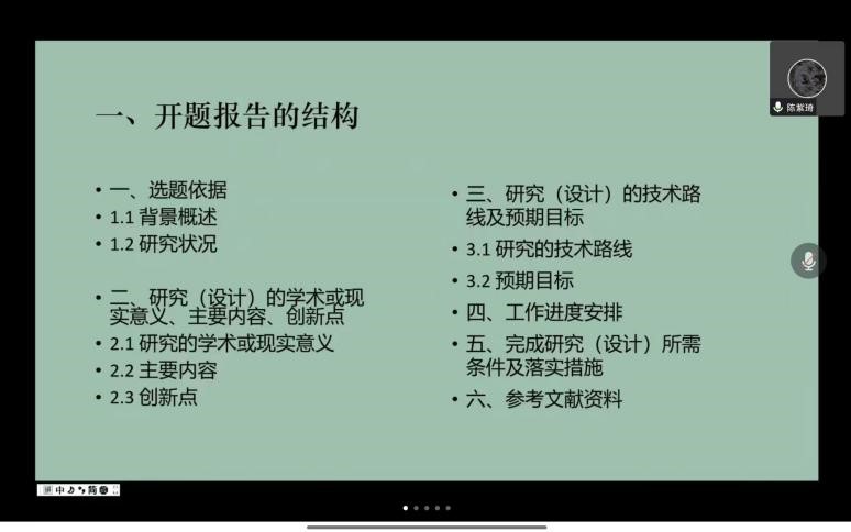 第一,本科毕业论文开题报告的结构和内容。陈紫琦同学依次从选题依据背景、研究状况、研究的学术或现实意义、主要内容。创新点、研究的技术路线。预期目标、工作进度安排、完成研究所需条件及落实措施、参考文献等10个具体环节分别详细进行了方法和心得介绍。