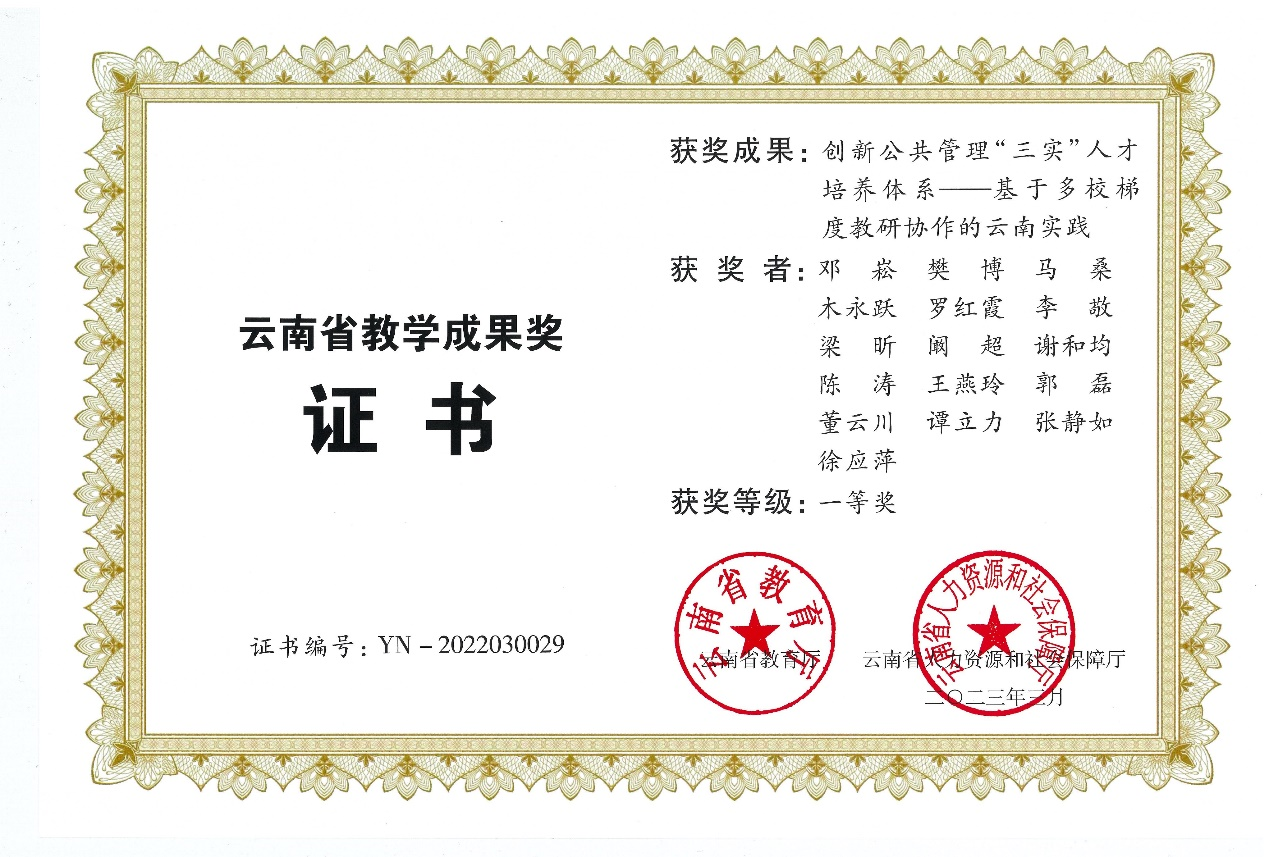 2023年3月,由邓崧教授领衔的团队成果《创新公共管理“三实”人才培养体系——基于多校梯度教研协作的云南实践》(YN-2022030029)获得云南省教学成果奖一等奖,标志着成果辐射进入新阶段,开启了公共管理教学研究和人才培养的新篇章,团队将向着一流团队建设目标继续前进。