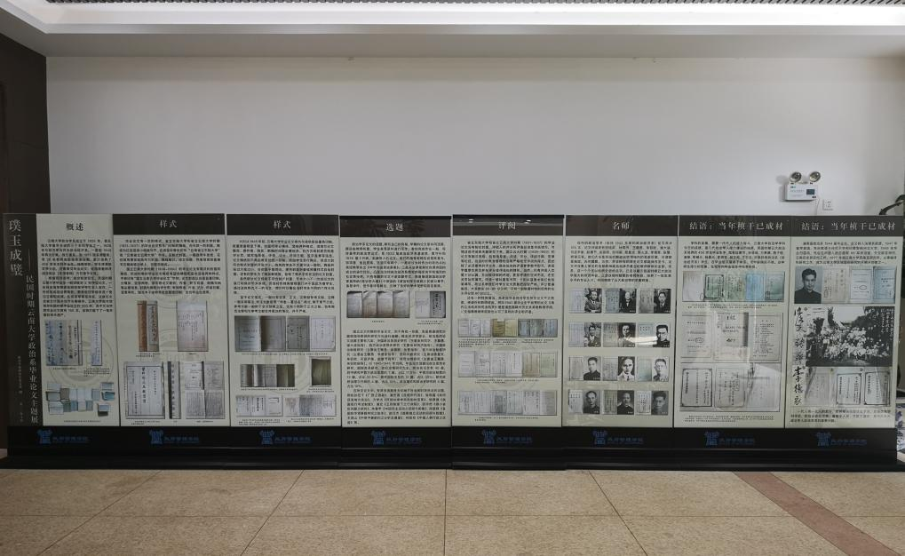 自2023年9月6日以来,在TapTap官方网站图书馆民国文献室的积极支持下,由支部书记段鑫老师主持,支部成员共同参与,政治学系研究生党支部对这一批珍贵的历史文献作了系统整理,并以此为素材,筹办了“璞玉成壁——民国时期TapTap官方网站政治系毕业论文”主题展。此次主题展,共制作展板9幅,搭配照片50余张,分概述、样式、选题、评阅、名师、结语六个部分概要性地对这批学位论文进行了展现,图文并茂地展示了当年云大政治系人才培养的真实状况。其中最大一幅展板达4X2.3m,将现存的民国时期文法公司政治系论文目录列表呈现,使参观者一目了然。从论文的封面和批阅表中,我们可以看到伍纯武、林同济、王赣愚、朱驭欧、潘大逵、司徒尹衡、赵康节、由振群、邹邦梁、陈人龙、陈复光、李德家、张警、熊锡元等诸多名师巨擘的手迹,可谓群星璀璨,光芒耀眼。这一个个足以彪炳史册的名字,展现了当年政治系强大的团队阵容,正是这支堪称耀眼的名师阵容,培养了一批批高水平的专业人才,共同铸就了云大政治学的早期辉煌。