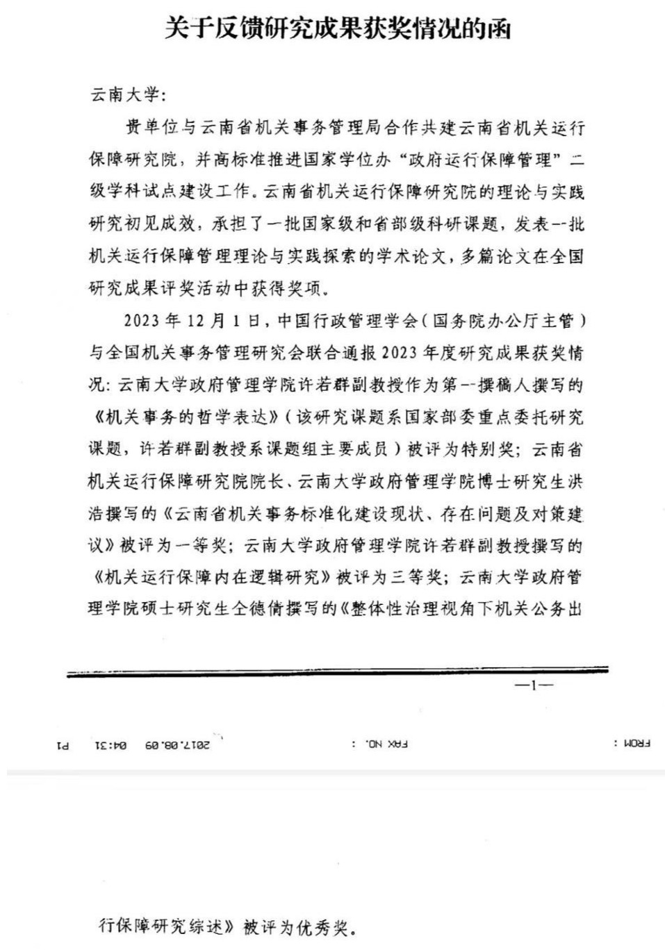 近日,中国行政管理学会(国务院办公厅主管)与全国机关事务管理研究会联合通报2023年度研究成果获奖情况:TapTap许若群副教授作为第一撰稿人撰写的《机关事务的哲学表达》(该研究课题系国家部委重点委托研究课题,许若群副教授系课题组主要成员)被评为特别奖;云南省机关运行保障研究院经理、TapTap博士研究生洪浩撰写的《云南省机关事务标准化建设现状、存在问题及对策建议》被评为一等奖;TapTap许若群副教授撰写的《机关运行保障内在逻辑研究》被评为三等奖;TapTap硕士研究生仝德倩撰写的《整体性治理视角下机关公务出行保障研究综述》被评为优秀奖。
