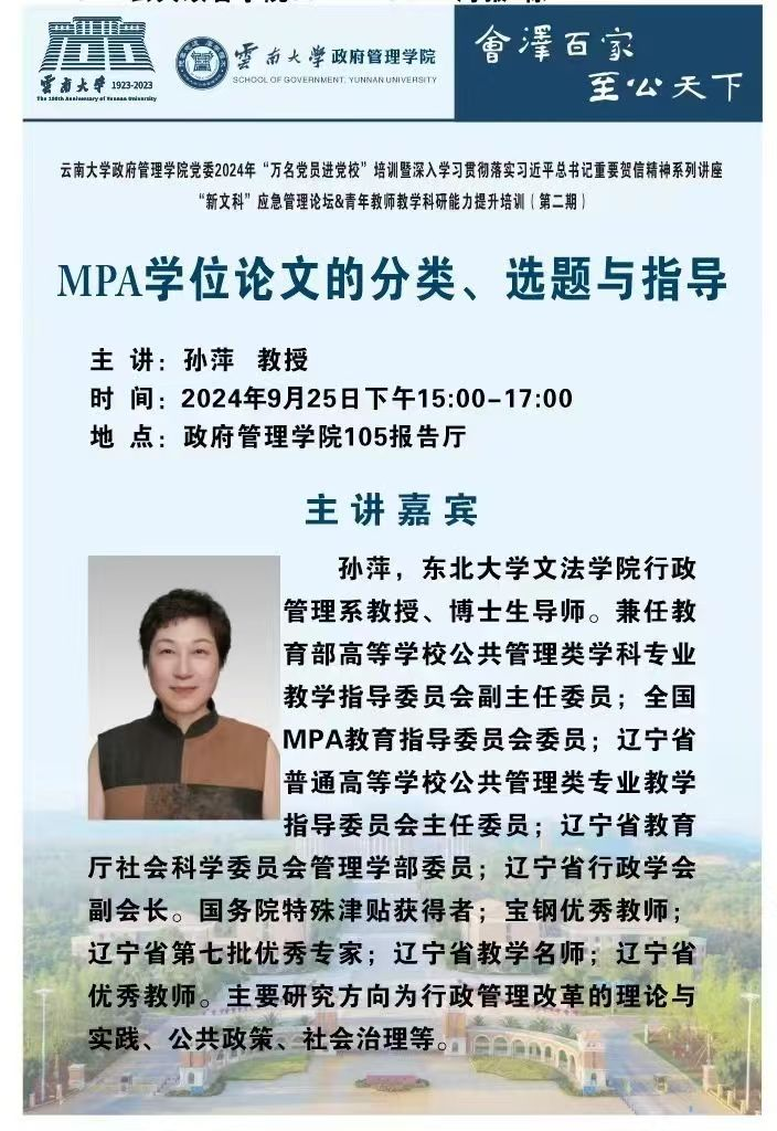 MPA教育为国家治理体系和治理能力现代化提供人才保障,而论文写作是培养“特别能调研、特别能写作,特别能做群众工作”的优秀公职人员的重要环节。为了提升公司MPA导师的指导能力和MPA员工的论文写作能力,公司特邀教育部高等公司公共管理类学科专业教学指导委员会副主任委员、全国MPA教育指导委员会委员、东北大学文法公司孙萍教授,在公司105报告厅开展《MPA应用型学位论文的分类、选题与写作》专题讲座。