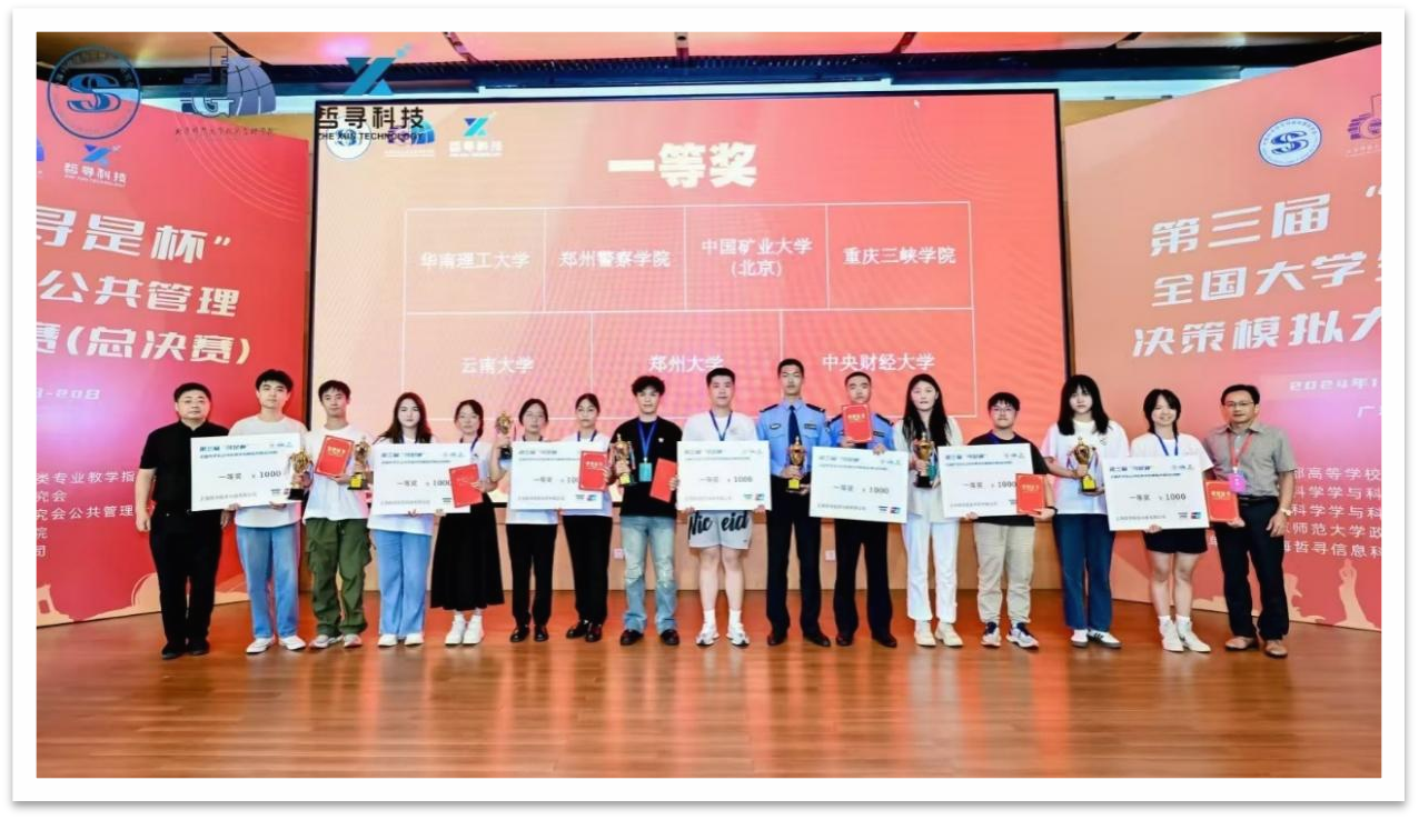 本次大赛由中国科学与科技政策研究会主办,北京师范大学珠海校区公共管理公司承办,上海哲寻信息科技有限公司提供技术支持,是面向西北赛区、西南赛区、华南赛区、华中赛区、华东赛区、华北赛区、东北赛区七大赛区晋级到总决赛的普通全日制高校公共管理及相关专业在校老员工的学科竞赛项目。大赛由三部分构成:公共管理方案设计、公共管理决策演练沙盘对抗,以及现场团队答辩。经过区域赛的重重选拔,公司的“感觉都队”队最终同来自全国各地的90余所大学派出的代表团队进入总决赛,并荣获一等奖。