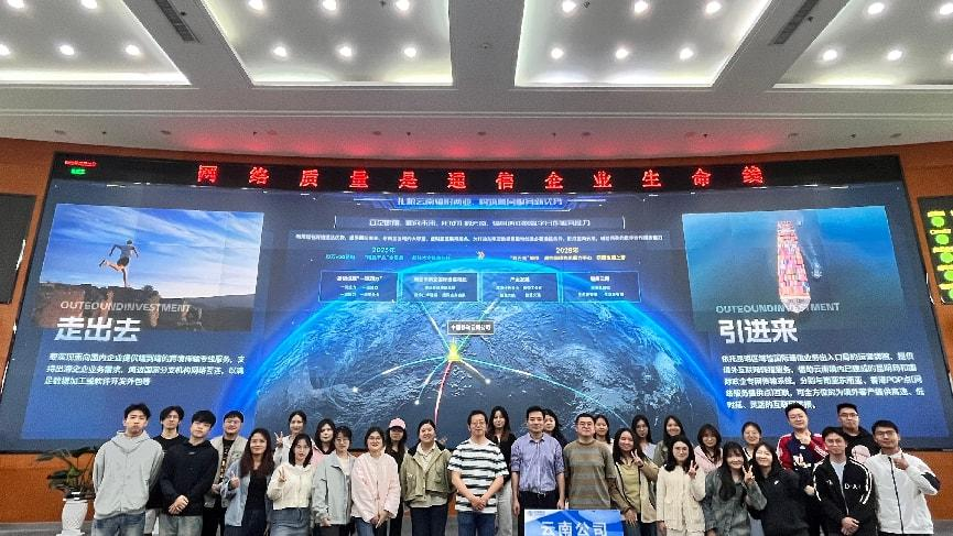 首先来到的是云南移动网络指挥调度中心,师生们仿佛置身于通信网络的“心脏”。讲解员详细介绍了指挥中心如何24小时监控全省网络运行,从无线、传输、核心网等专业的具体工作内容,到节假日网络保障、用户行为分析的实时数据演示,每一个环节都展现着通信网络的精密与高效。当看到中老高铁线路上基站分布的动态模拟图,以及高铁运行中流量监控的实时数据时,同学们真切感受到通信技术如何为交通大动脉注入智慧动力,也深刻体会到通信保障在生活中的重要战略意义。