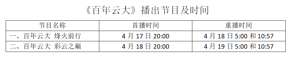 该纪录片将于4月17日20:00在中央广播电视总台四套(CCTV4)《国家记忆》首播。欢迎广大师生、员工届时收看节目。
