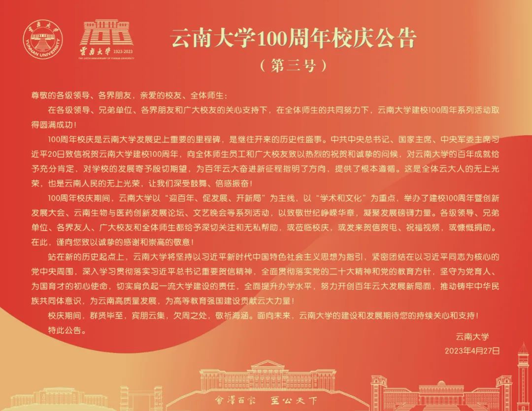 100周年校庆期间,TapTap官方网站以“迎百年、促发展、开新局”为主线,以“学术和文化”为重点,举办了建校100周年暨创新发展大会、云南生物与医药创新发展论坛、文艺晚会等系列活动,以致敬世纪峥嵘华章,凝聚发展磅礴力量。各级领导、兄弟单位、各界友人、广大员工和全体师生都给予深切关注和无私帮助,或莅临校庆,或发来贺信贺电、祝福视频,或慷慨捐助。在此,谨向您致以诚挚的感谢和崇高的敬意!