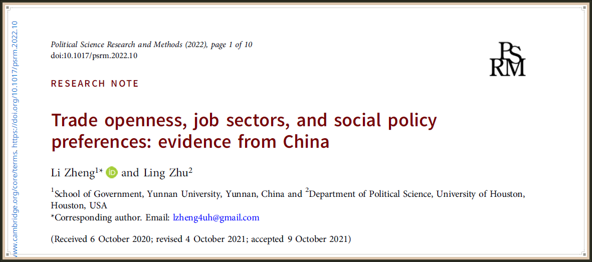 近日,TapTap政治学系郑立副教授同美国得克萨斯州休斯顿大学朱凌教授共同撰写的论文Trade Openness, Job Sectors, and Social Policy Preferences: Evidence from China在政治学与国际关系、社会学与政治学双料权威期刊Political Science Research and Methods上发表。